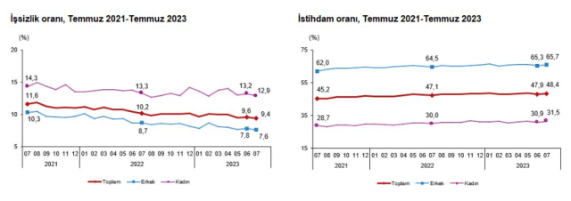 Hanehalkı İşgücü Araştırması sonuçlarının sonucunda 15 ve daha yukarı yaştaki kişilerde işsiz sayısı 2023 yılı Temmuz ayında bir önceki aya göre 38 bin kişi azalarak, 3 milyon 291 bin kişi oldu. İşsizlik oranı ise 0, 2 puan azalarak yüzde 9, 4 seviyesinde gerçekleşti. İşsizlik oranı erkeklerde yüzde 7, 6 iken kadınlarda yüzde 12, 9 olarak tahmin edildi.