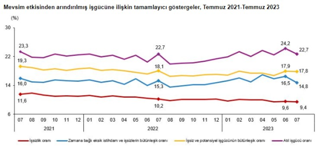 TÜİK verilerine göre, Temmuz'da mevsim etkisinden arındırılmış işsizlik oranı yüzde 0, 2 oranında azalarak yüzde 9, 4 seviyesinde gerçekleşti. Mayıs ve Haziran aylarından sonra üçüncü ayda da tek hane olarak veri kaydedilmiş oldu. Geniş tanımlı işsizlik yüzde 22, 7 olarak izlenirken genç işsizliği de yüzde 18 olarak kaydedildi.