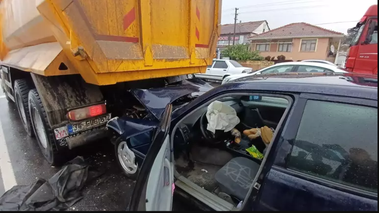Düzce’de yağışlı havada D-655 Karayolu ışıklı kavşakta bekleyen kamyona durmayan otomobil arkadan çarptı.
