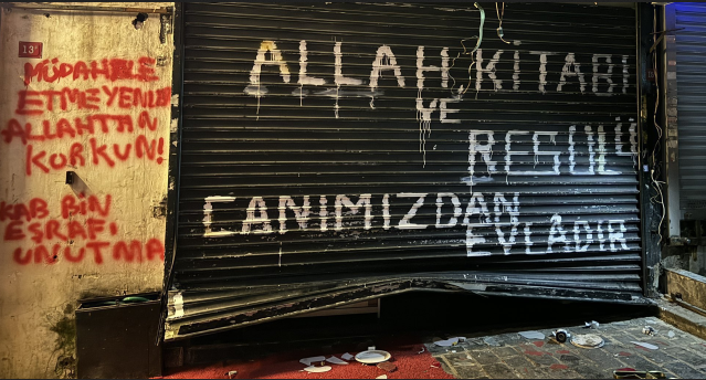 Dükkanın kepenklerine "Müdahale etmeyenler Allah'tan korkun" gibi yazılar yazan grup yaşanan olaya tepki gösterip sloganlar attı