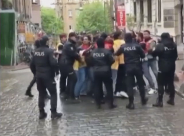 İstanbul Taksim'deki İstiklal Caddesi'nde toplanan ve Taksim Meydanı'na yürümeye çalışan yaklaşık 15 kişilik gruba polis müdahale etti. Pankart açıp yürüyen grup, polis tarafından gözaltına alındı.