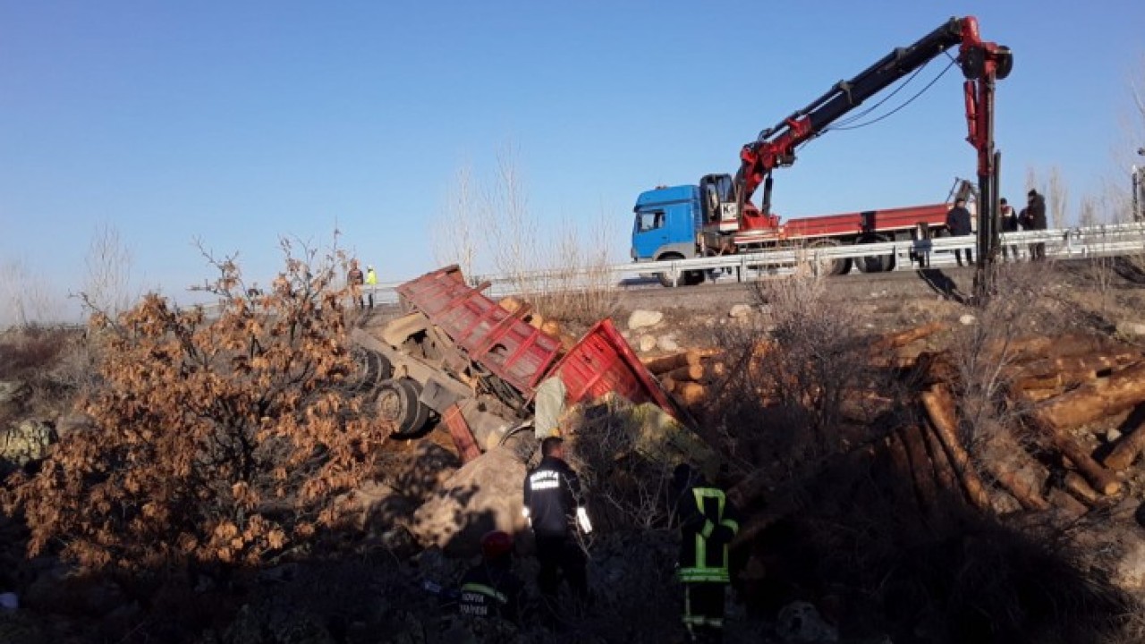 KONYA (AA) -Emrah Elmas (41) idaresindeki 07JH 937 plakalı tomruk yüklü kamyon, Seydişehir-Antalya kara yolunun 30. kilometresinde şarampole devrildi.