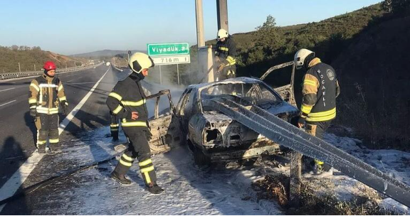 Kuzey Marmara Otoyolu Gebze ilçesi Yağcılar mevkisinde meydana gelen kazada İstanbul istikametine giden F.A.’nın (32) kullandığı 25 LA 774 plakalı otomobil, yoldan çıkarak bariyerlere çarptı.25 metre sürüklenip bariyerlere saplanan, otomobilin içinde bulunan sürücü F.A. ile yolcular M.K. ve M.Ş. (26) kendi imkanlarıyla araçtan çıktı. Kazada otomobil, daha sonra alev alıp yanmaya başladı.