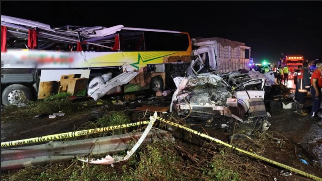 Mersin- Adana Otoyolu Tarsus ilçesi Yenice Kütüklü mevkiinde dün akşam saatlerinde meydana gelen kazada Alınan bilgiye göre, Adana istikametinden gelen Mercedes marka 34 SD 8821 plakalı yolcu otobüsünün yağışlı havada kayarak devrilip karşı şeride geçmesiyle biri otomobil, biri pikap, biri de kamyon olmak üzere 4 aracın karıştığı zincirleme kaza meydana geldi.