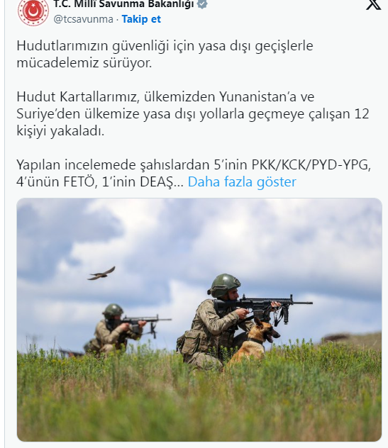 Hudutlarımızın güvenliği için yasa dışı geçişlerle mücadelemiz sürüyor. Hudut Kartallarımız, ülkemizden Yunanistan’a ve Suriye’den ülkemize yasa dışı yollarla geçmeye çalışan 12 kişiyi yakaladı. Yapılan incelemede şahıslardan 5’inin PKK/KCK/PYD-YPG, 4’ünün FETÖ, 1’inin DEAŞ terör örgütü mensubu olduğu belirlendi.