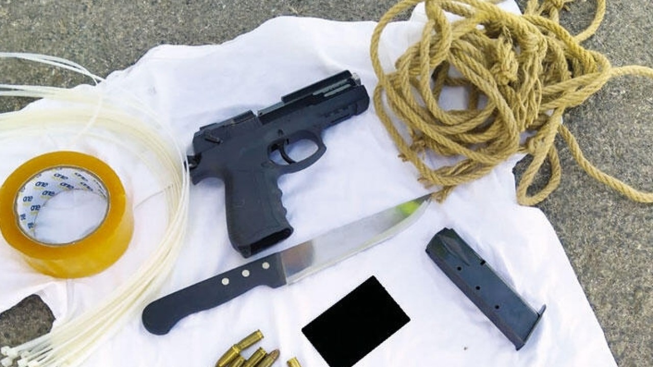M.A.’nın yapılan üst aramasında 9 milimetre çapında tabanca, bu silaha ait 14 mermi, 28 santimetre uzunluğunda bıçak, 10 plastik kelepçe, 1’er metre olarak kesilmiş uçları düğümlü 5 kendir ip ve koli bandı ele geçirildi. M.A.’nın sorgusunun ardından adliyeye sevk edileceği belirtildi.