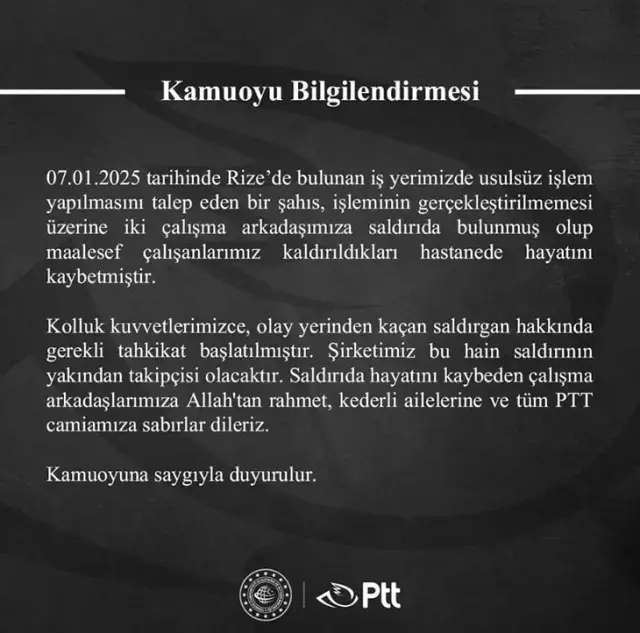 "7 Ocak 2025 tarihinde Rize’deki iş yerimizde usulsüz işlem yapılmasını talep eden bir şahıs, işlemin gerçekleştirilmemesi üzerine iki çalışma arkadaşımıza saldırıda bulunmuş, maalesef hayatlarını kaybetmişlerdir. Kolluk kuvvetlerimizce saldırgan hakkında gerekli tahkikat başlatılmıştır. Bu hain saldırının yakından takipçisi olacağız. Hayatını kaybeden çalışma arkadaşlarımıza Allah’tan rahmet, ailelerine ve tüm PTT camiamıza başsağlığı dileriz."