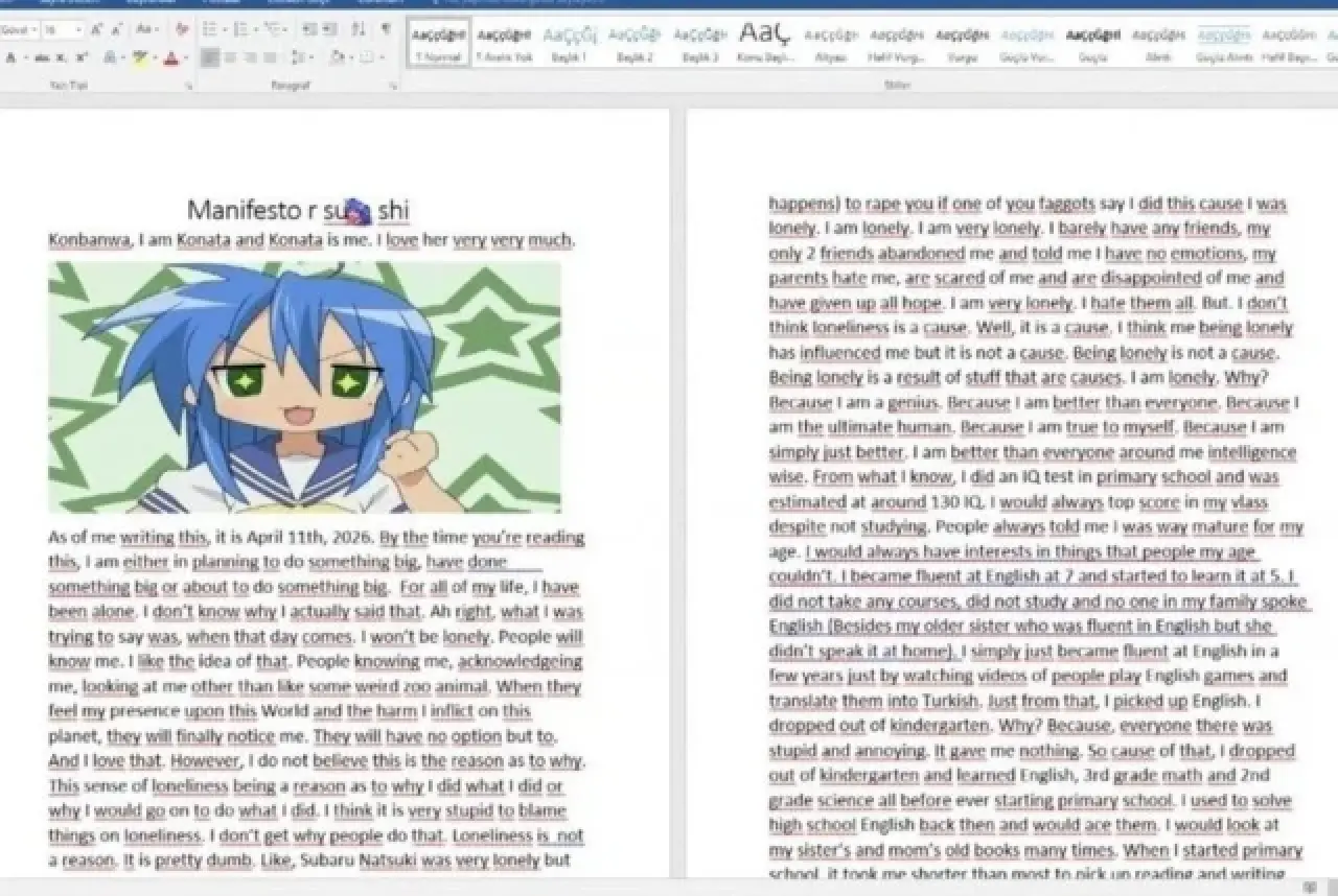 “Bunu yazarken tarih 11 Nisan 2026. Sen bunu okuduğunda ya bir şey planlıyor olacağım, yapmış olacağım ya da yapmak üzere olacağım. Hayatım boyunca hep yalnız kaldım… İnsanların beni tanıması, fark etmesi hoşuma gidiyor. Bu dünyadaki varlığımı ve verdiğim zararı hissetsinler istiyorum.”