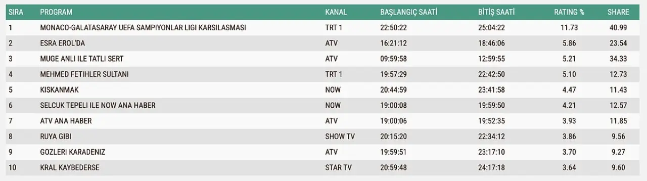 Geçtiğimiz haftalarda Salı günlerinin en çok izlenen yapımı olma başarısını gösteren "Kıskanmak" dizisi, bu hafta beklenen izlenme oranlarının altında kaldı. Galatasaray maçının yarattığı güçlü rekabet ortamında önemli ölçüde izleyici kaybeden dizi, liderlik koltuğunu devretti. Buna karşılık TRT 1 ekranlarının yüksek bütçeli tarihi yapımı "Mehmed: Fetihler Sultanı", sadık izleyici kitlesini koruma konusunda daha dirençli bir performans sergiledi. Mevcut şartlar altında diziler kategorisinin birincisi olmayı başaran yapım, genel sıralamada maçın ardından en güçlü alternatif içerik olarak öne çıktı. "Gözleri Karadeniz" ise kemikleşmiş izleyicisiyle tablodaki yerini korumaya çalıştı.