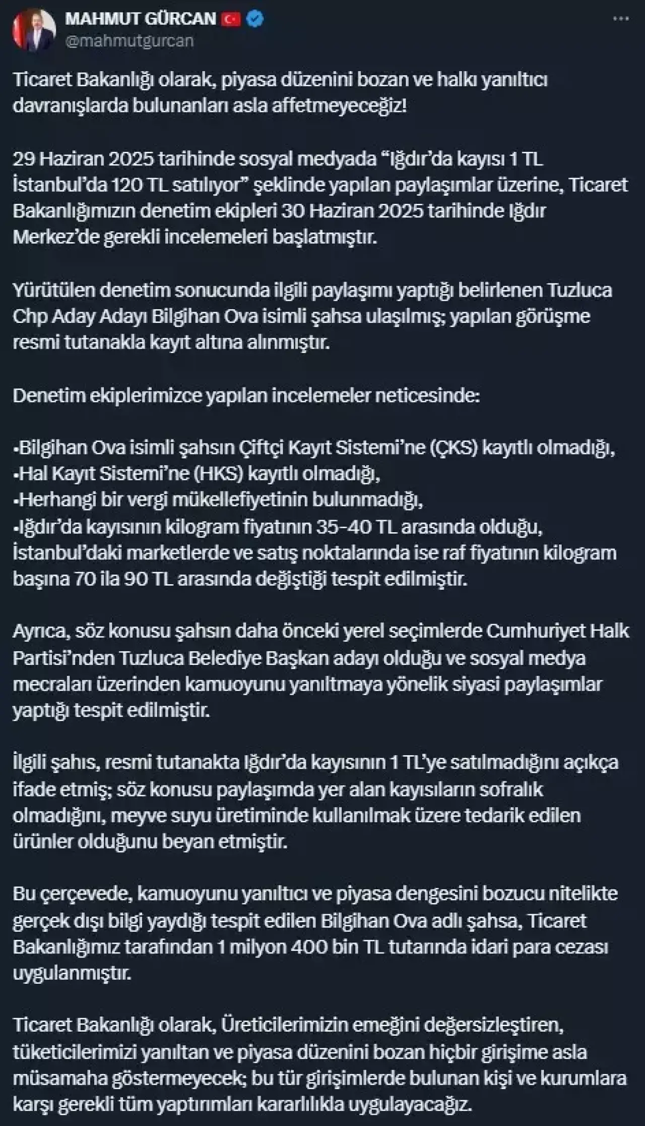 Ticaret Bakan Yardımcısı Mahmut Gürcan, Iğdır’da kayısının 1 TL, İstanbul’da 120 TL’ye satıldığını iddia eden CHP’li eski aday Bilgehan Ova’ya, kamuoyunu yanıltıcı ve piyasa dengesini bozucu bilgi yaydığı gerekçesiyle 1 milyon 400 bin TL idari para cezası uygulandığını açıkladı.