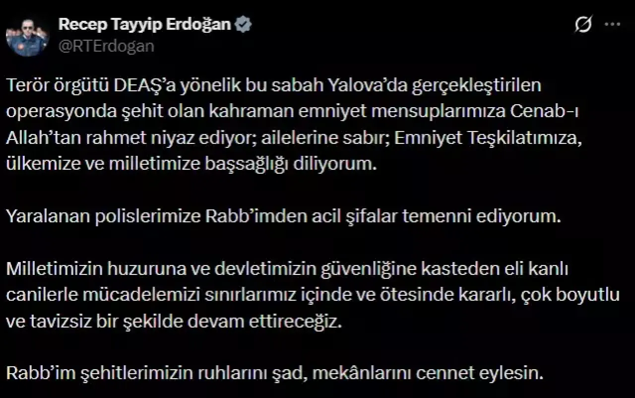Yalova’da terör örgütü DEAŞ’a yönelik gerçekleştirilen operasyon sırasında çıkan çatışmada 3 polis memurunun şehit olması üzerine Cumhurbaşkanı Recep Tayyip Erdoğan sosyal medya hesabından açıklama yaptı. Erdoğan, şehitler için rahmet dilerken yaralanan güvenlik görevlilerine de acil şifa temennisinde bulundu.