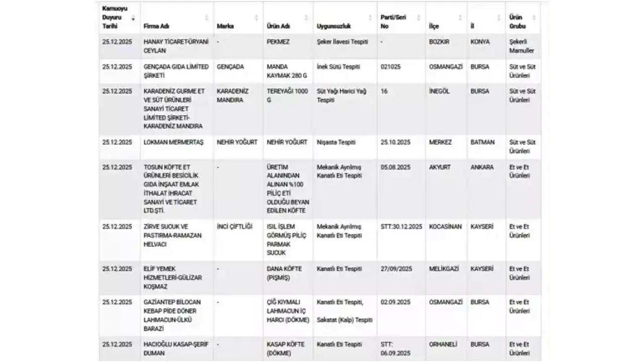 Güncellenen listede bal, yoğurt, kıyma ve baharatlar gibi çok sayıda temel gıda ürünü yer aldı. Yapılan denetim ve analizler sonucunda, tüketiciyi yanıltan içeriklere ve mevzuata aykırı uygulamalara rastlandığı bildirildi.