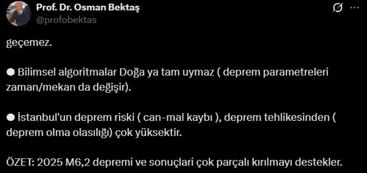 Bektaş, İstanbul açısından asıl tehlikenin depremin büyüklüğünden çok, olası can ve mal kaybı riski olduğunun altını çizdi. Megakentin yapı stoku, nüfus yoğunluğu ve altyapı sorunlarının bu riski artırdığını vurguladı.
