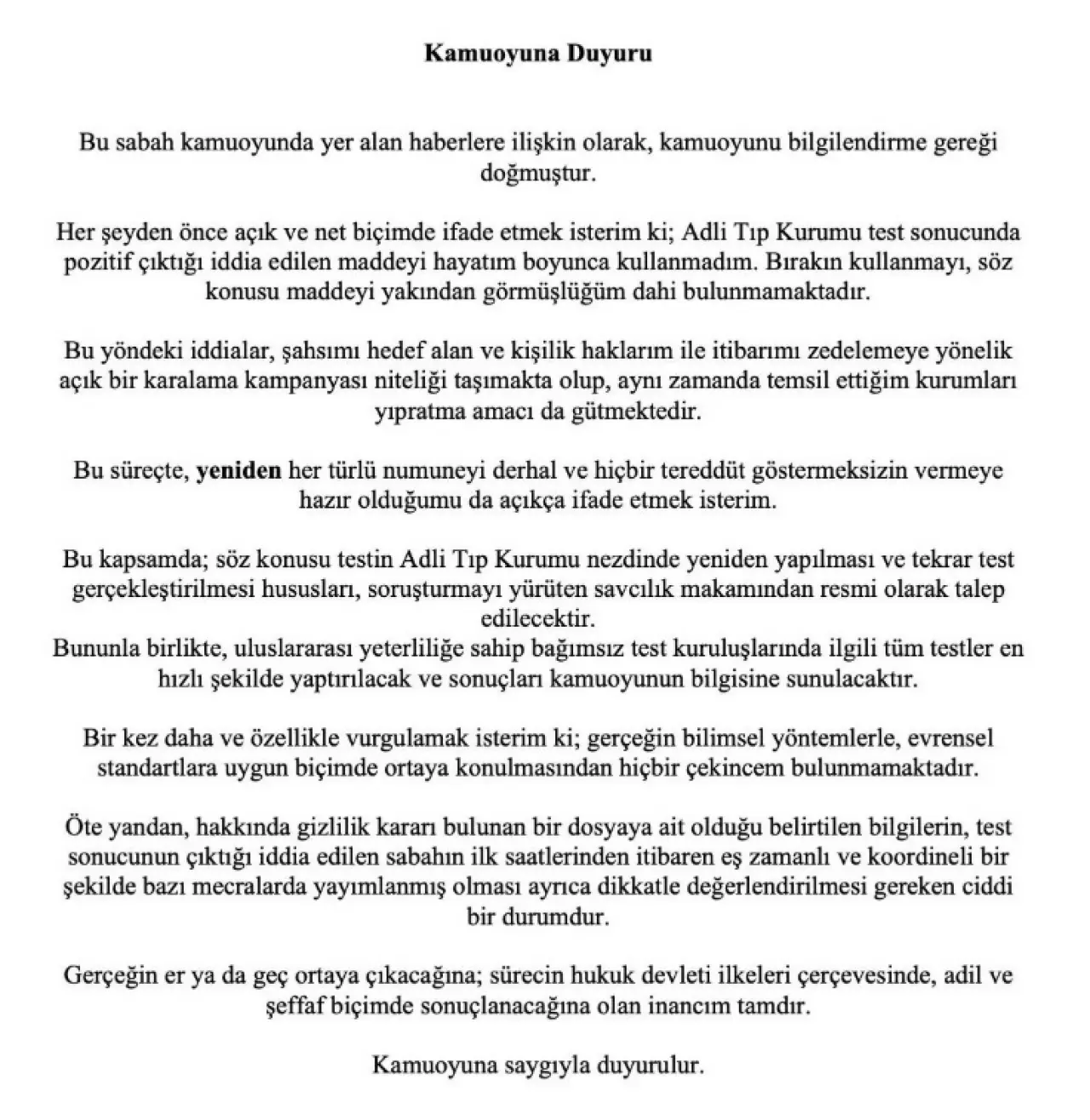 Her şeyden önce açık ve net biçimde ifade etmek isterim ki; Adli Tıp Kurumu test sonucunda pozitif çıktığı iddia edilen maddeyi hayatım boyunca kullanmadım. Bırakın kullanmayı, söz konusu maddeyi yakından görmüşlüğüm dahi bulunmamaktadır.