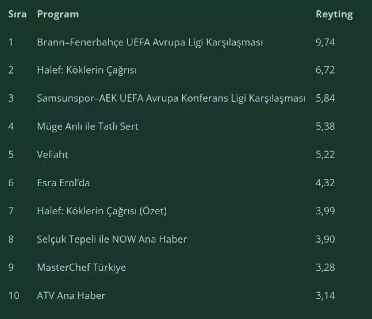 Total grubunda ise durum farklılaştı. NOW TV'nin sevilen dizisi "Halef: Köklerin Çağrısı", genel izleyici kitlesinde birinci sıraya yerleşerek maç yayınını geride bıraktı. Gündüz kuşağının değişmez liderleri Müge Anlı ve Esra Erol da üst sıralardaki yerini korudu.