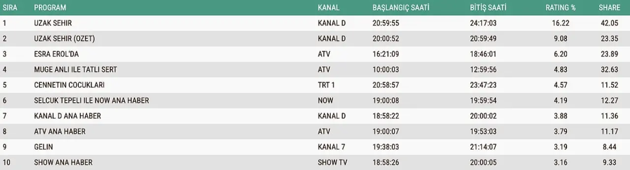 Cennetin Çocukları’nın istikrarlı yükselişi, Pazartesi akşamındaki rekabet dengelerini yeniden şekillendiriyor. Özellikle Uzak Şehir’in puan kaybettiği kategorilerde yükselmesi, izleyici kaymasının bir göstergesi olarak değerlendiriliyor. Gündüz kuşağında ise Müge Anlı ve Esra Erol, Total listesinde üst sıralardaki yerlerini koruyarak televizyon kanallarının en güçlü lokomotifleri olmayı sürdürüyor.