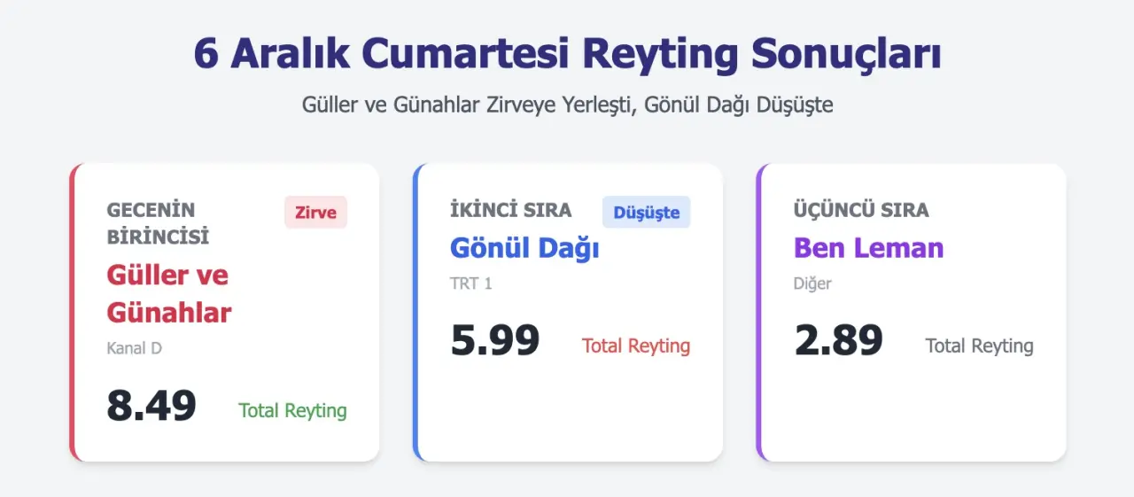 6 Aralık Cumartesi akşamı ekranlar, reyting rekabetinde zirveyi paylaşan iki diziye sahne oldu. Kanal D'nin iddialı yapımı Güller ve Günahlar, yeni bölümünde tüm kategorilerde liderliği kaptı ve Total'de 8.49, AB grubunda 5.25, ABC1'de 7.54 oranlarıyla günü domine etti. TRT 1'in uzun soluklu dizisi Gönül Dağı ise Total'de 5.99, AB'de 3.32 ve ABC1'de 4.44 puanla ikinci sıraya yerleşti. Bu sonuçlar, Güller ve Günahlar'ın son haftalardaki yükselişini pekiştirdi. Dizi, yayınlandığı günden beri Gönül Dağı'nın tahtını zorluyor ve bu hafta farkı açtı. NOW TV'nin Ben Leman'ı ise Total'de 2.89, AB'de 3.95 ve ABC1'de 3.18 reytingle üçüncü oldu. Reyting verileri, izleyici alışkanlıklarını yansıtırken, yapımcılar için stratejik kararlara yol açtı.