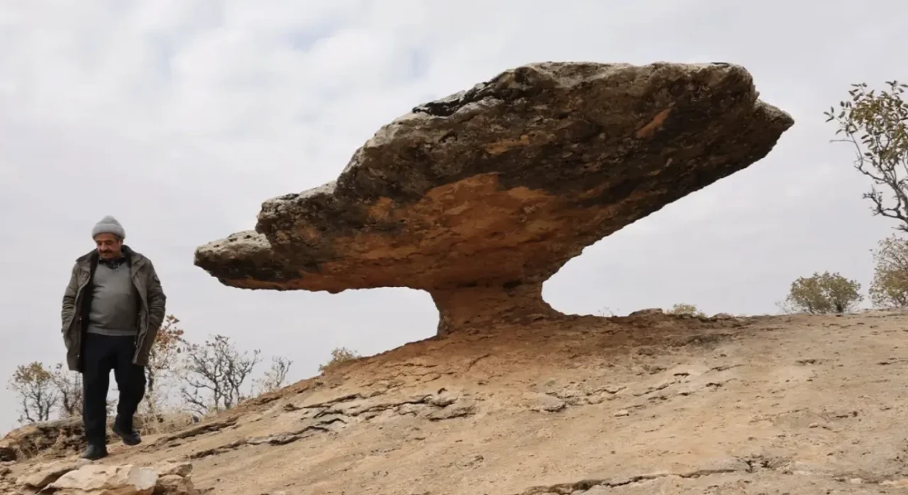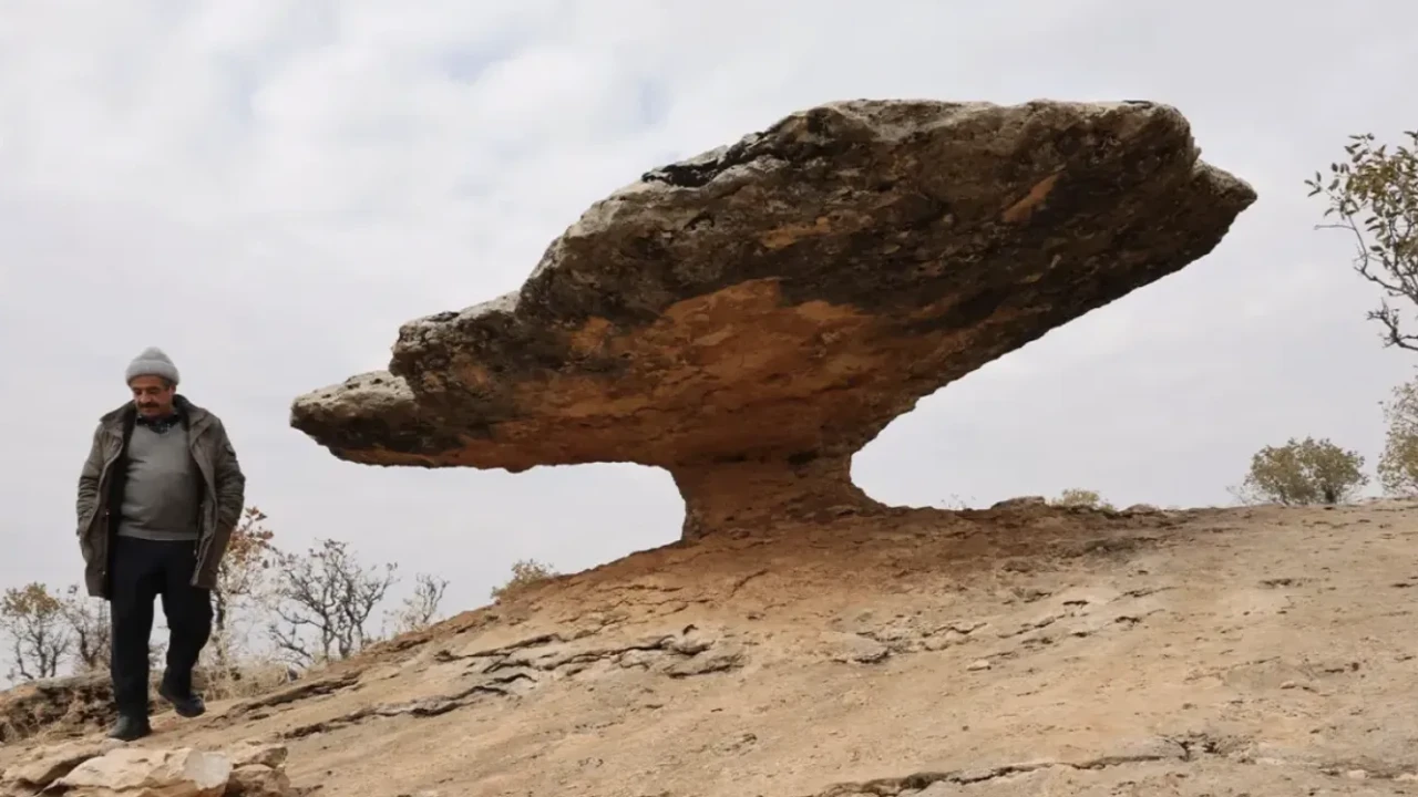 Diyarbakır’ın Kocaköy ilçesinde yer alan ve halk arasında “kalkan kaya” ya da “mantar kaya” olarak bilinen jeolojik oluşum, hem dikkat çekici yapısıyla hem de milyonlarca yıl süren hareketliliğiyle doğaseverlerin ilgisini çekiyor. İnce bir sütun üzerine oturmuş devasa kaya parçası, buzul çağının günümüze ulaşan nadir kalıntılarından biri olarak değerlendiriliyor.