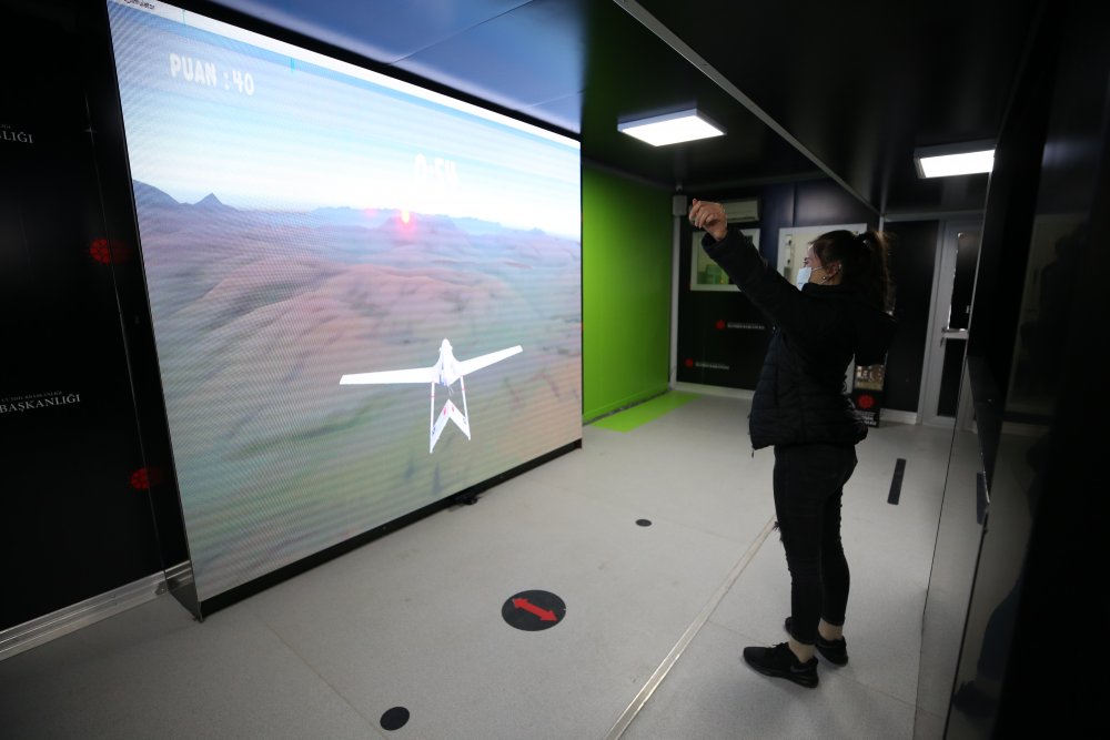 Özel olarak üretilen harekete duyarlı ekran da ileri teknoloji hareket algılama sistemleriyle yanından geçen veya karşısında duran ziyaretçinin hareketlerini animasyon olarak yansıtıyor. Ziyaretçilere bu alanda, Türkiye'nin milli gururu insansız hava aracı (İHA) ile uçuş deneyimi imkanı sağlanıyor.