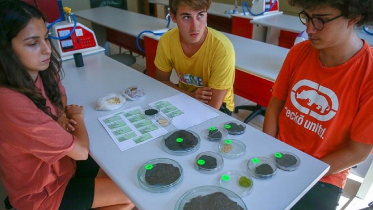 Öğrenciler Tuna Altun, Sahra Bayraktar ve Ege Doğanay, öğretmenleri Yasemin Horasan danışmanlığında asma budama atıkları, kargı kamışı, deniz marulu ve zeytin kara suyunun biyoplastik üretiminde kullanılabilirliğinin araştırılması için proje geliştirdi.