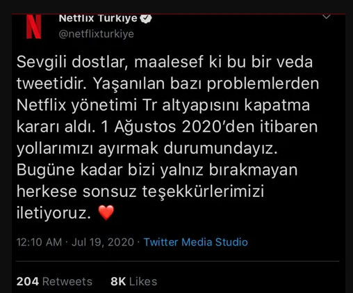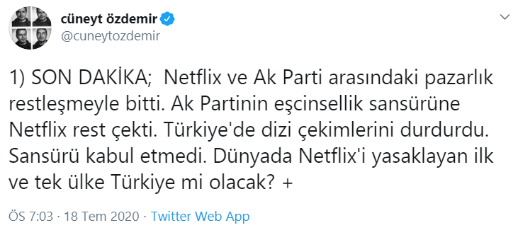 "Netflix ve Ak Parti arasındaki pazarlık restleşmeyle bitti. Ak Partinin eşcinsellik sansürüne Netflix rest çekti. Türkiye'de dizi çekimlerini durdurdu. Sansürü kabul etmedi. Dünyada Netflix'i yasaklayan ilk ve tek ülke Türkiye mi olacak?"