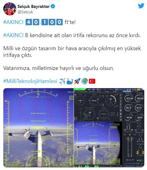 "AKINCI B kendisine ait olan irtifa rekorunu az önce kırdı. Milli ve özgün tasarım bir hava aracıyla çıkılmış en yüksek irtifaya çıktı. Vatanımıza, milletimize hayırlı ve uğurlu olsun."