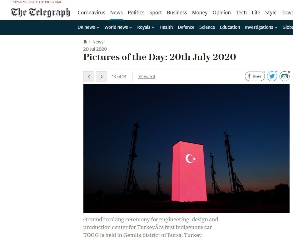 İngiltere'nin önde gelen gazetelerinden The Telegraph, Türkiye'nin yerli otomobili TOGG'u günün önemli gelişmesi olarak gösterdi ve günün fotoğrafları arasına aldı.
