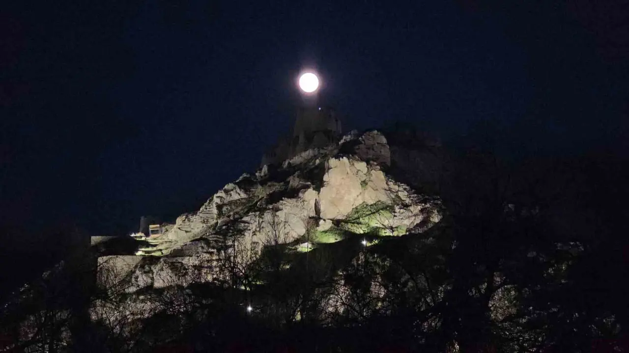 Baharın habercisi olarak bilinen pembe dolunay, Erek Dağı’nın karlı zirvesiyle birleşerek kartpostallık görüntüler oluşturdu. Gökyüzünde beliren dolunayın ışıltısı, şehir silüetini aydınlatırken vatandaşların yoğun ilgisini çekti.