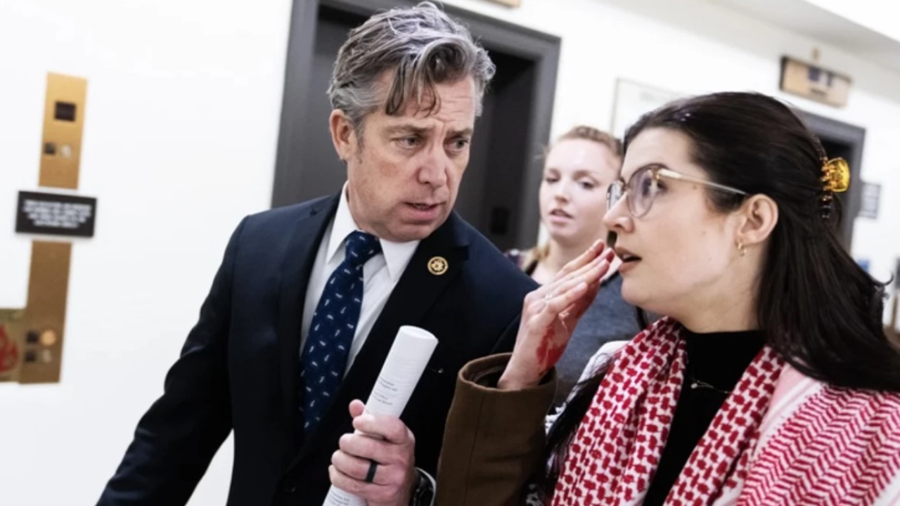 ABD Kongre Üyesi Andy Ogles'ın meclis koridorlarında yakalayan bir kadın, "Vergilerimle Gazze'de çocuklar bombalanıyor" tepkisinde bulundu.