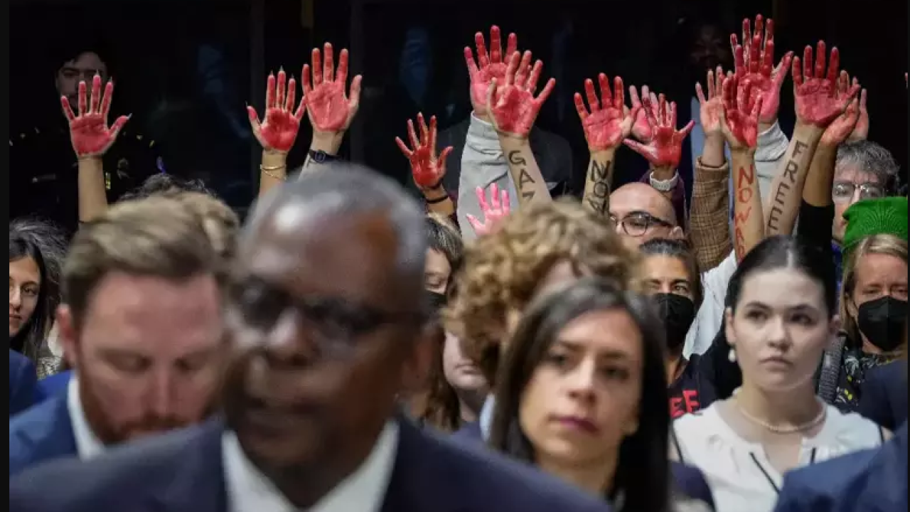 Senato Ödenek Komitesi’nde, İsrail ve Ukrayna'ya yapılacak yardımlar için Savunma Bakanı Lloyd Austin ile hazır bulunan ABD Dışişleri Bakanı Antony Blinken Senato Ödenek Komitesi’nde İsrail ve Ukrayna'ya yapılacak yardımları da içeren 106 milyar dolarlık ulusal güvenlik fonu talebi hakkında açıklama yaptığı sırada, elleri kırmızı boyalı savaş karşıtları tarafından protesto edildi.