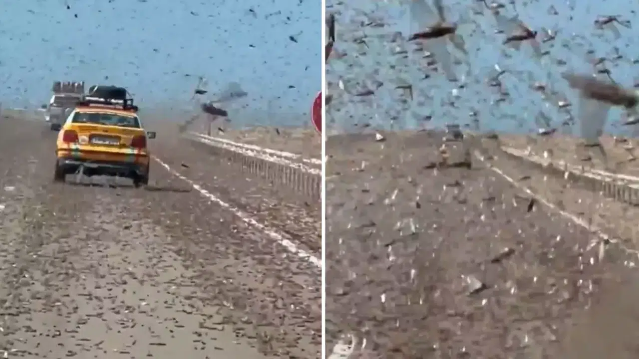 Batı Sahra’nın Boujdour kentinde görülen yoğun çekirge sürüsü, bir otoyolu adeta istila etti. Gökyüzünü kaplayan sürü ve araçlara çarpan çekirgeler sosyal medyada geniş yankı uyandırdı.