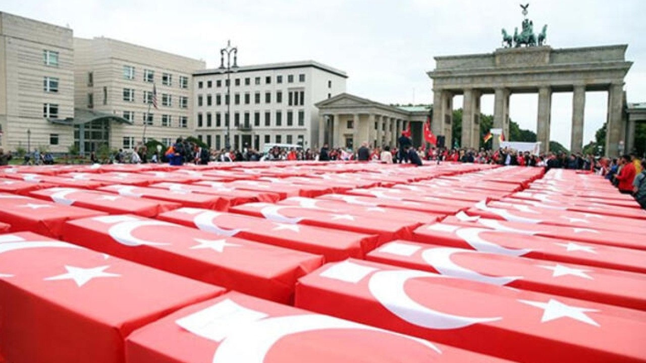 Hacivat Sanat ve Kültür Derneği tarafından gerçekleştirilen etkinlikte, şehitlerin isimlerinin bulunduğu Türk bayrağına sarılı 251 tabut, Berlin'in tarihi Brandenburg Kapısı ve ABD'nin Berlin Büyükelçiliği önüne konuldu.