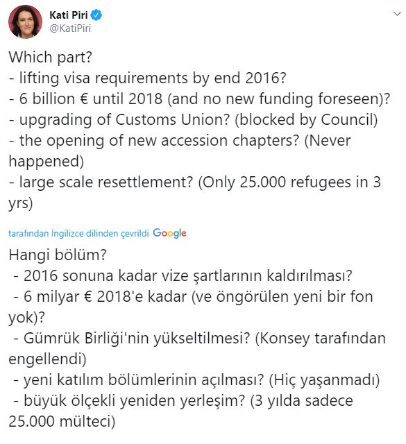 AP eski Türkiye Raportörü Kati Piri Twitter hesabı üzerinden yaptığı açıklamada, AB'nin Türkiye'ye mülteci anlaşmasına uyma çağrısını eleştirdi. Kati Piri, "Türkiye hangi bölümüne uymalı? 2016'da vizelerin kaldırılacağı belirtilmişti; 2018'e kadar 6 milyar euro taahhüt edilmişti ancak fonlarda gecikme yaşanıyor, yeni fon öngörülmüyor; yeni fasılların açılması söz konusu bile değil; öte yandan 3 yılda sadece 25 bin mülteci yeniden yerleştirildi." dedi.