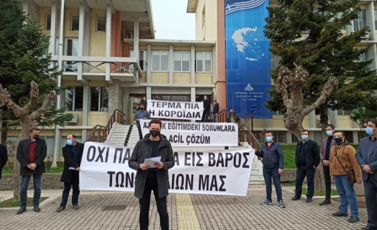 Azınlık Okulları Encümenler Derneğinin kararıyla Gümülcine ve İskeçe'de gerçekleştirilen eylemde veliler, azınlık okullarındaki encümen heyetlerinin görev süresinin sona ermesinin ardından Yunanistan Eğitim ve Dinişleri Bakanlığınca 22 Aralık 2020'de yapılacağı ilan edilen seçimlerinin Kovid-19 salgını gerekçesiyle art arda ertelenmesini protesto etti.