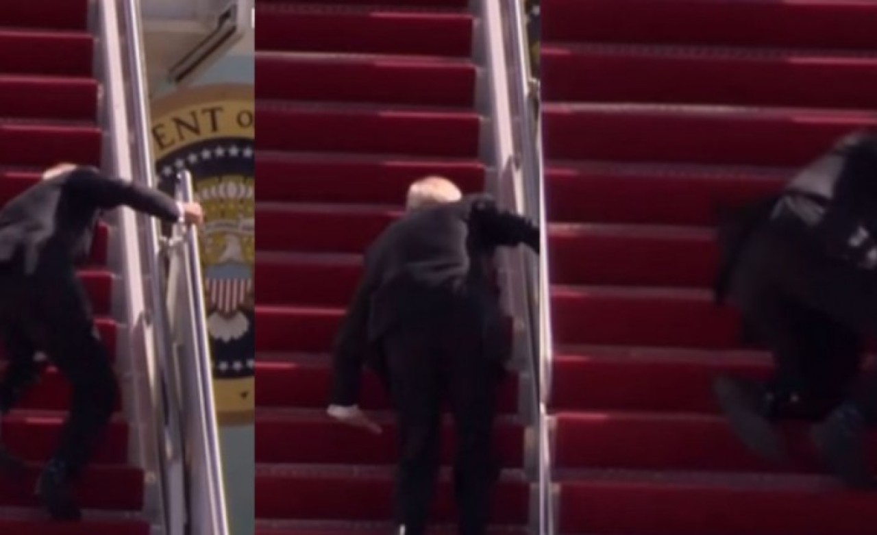 Basının sorularını yanıtladıktan sonra uçağın merdivenlerini çıkmaya başlayan Biden'ın ayağının üç kere takılması sonucu yere kapaklandığı anlar ülke basınında ve sosyal medyada gündeme oturdu.