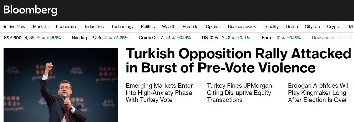 ABD'nin önde gelen medya kuruluşlarından Bloomberg, "Türkiye’de muhalefetin mitingi seçim öncesi şiddet patlamasıyla saldırıya uğradı” manşetini attı.