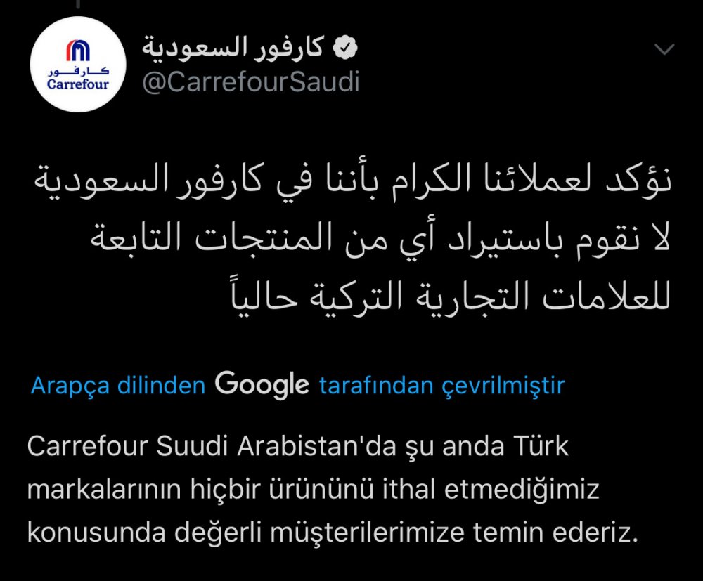 Fransa'ya ait Carrefour, Suudi Arabistan temsilciğiline ait resmi Twitter hesabından Arap vatandaşlara Türk ürünlerini satmadıklarını duyurdu.