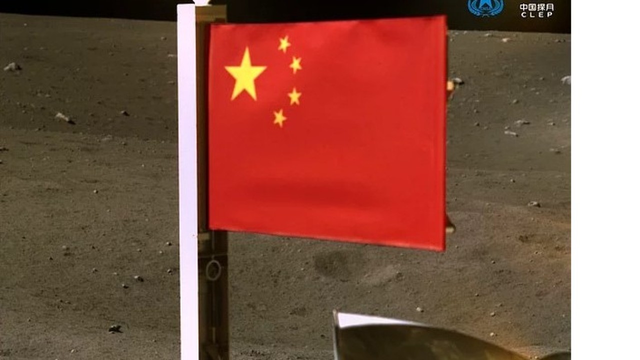 Çin Ulusal Uzay İdaresi, topladığı taş örnekleriyle Dünya'ya gelmek üzere Ay'dan ayrılan Chang'e 5'in başarıyı kutlamak için açtığı 5 yıldızlı kırmızı Çin bayrağının fotoğraflarını yayımladı.