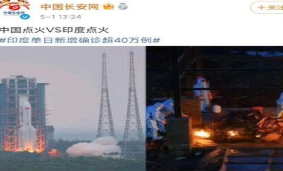 Çin'in sosyal medya sitesi Weibo'da yapılan paylaşımda, Çin'de fırlatılan bir roket ile Hindistan'da koronavirüs nedeniyle hayatını kaybeden kişilerin parklarda yakıldığı fotoğraf yan yana koyularak "Çin'de yakılan ateş ile Hindistan'da yakılan ateş arasındaki fark" yazılmıştı. Cumartesi akşamüstü yapılan bu paylaşım tepkilerin ardından silindi.