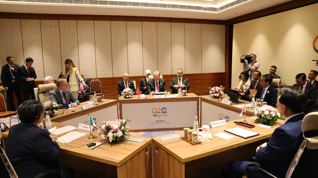 Bharat Mandapam Uluslararası Fuar ve Kongre Merkezi'ndeki görüşmede konuşan Erdoğan, Endonezya Devlet Başkanı Joko Widodo, Güney Kore Devlet Başkanı Yoon Suk-Yeol, Avustralya Başbakanı Anthony Albanese, Meksika Ekonomi Bakanı Raquel Buenrostro'yu selamlayarak sözlerine başladı.