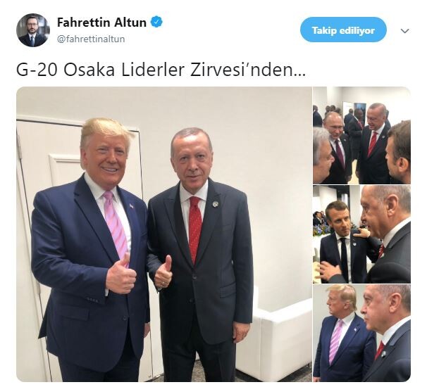 "G-20 Osaka Liderler Zirvesi’nden" başlığıyla yaptığı paylaşımında Altun, Cumhurbaşkanı Erdoğan'ın ABD Başkanı Donald Trump, Rusya Devlet Başkanı Vladimir Putin, Fransa Cumhurbaşkanı Emmanuel Macron ile ayaküstü yaptığı sohbetlere ilişkin fotoğraf karelerine yer verdi.