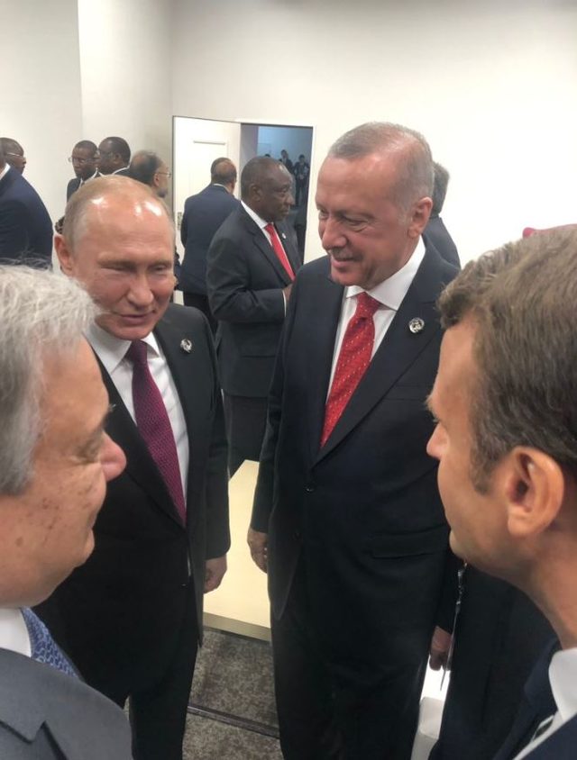 Erdoğan, çalışma yemeği öncesinde Rusya Devlet Başkanı Vladimir Putin ile ayaküstü sohbet etti. Sohbet sırasında Dışişleri Bakanı Mevlüt Çavuşoğlu ile Hazine ve Maliye Bakanı Berat Albayrak da hazır bulundu.