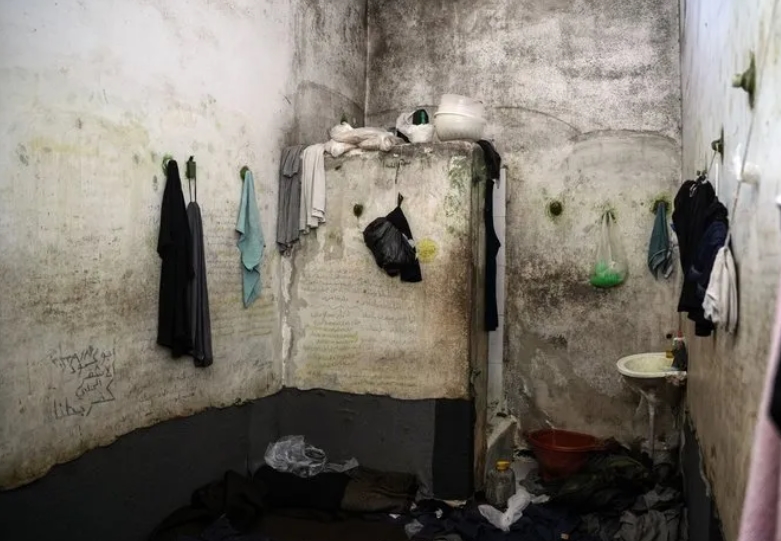 Mezze Hapishanesi’nde 10 kişinin kaldığı 2 metrekarelik hücrelerde mahkumlar yalnızca oturarak sığabiliyordu. Ayakta durmak mümkün olmadığı gibi, tuvalet ihtiyacı için pet şişeler kullanılıyordu. Khatip, “Aylarca oturarak uyuduk, bazen de sırayla cenin pozisyonunda dinlendik” dedi.