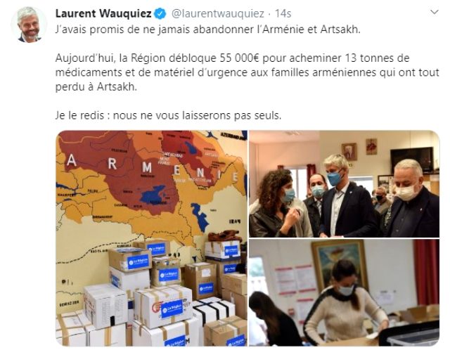 Fransa'da Auvergne Rhônes Alpes Belediye Başkanı Laurent Wauquiez de, Ermenistan için ilaç ve acil yardım malzemesi topladıklarını açıkladı. Ancak Fransız Başkan'ın ilaçları topladıktan sona paylaştığı harita tepki çekti. Wauquiez'ın paylaştığı haritada, Türkiye'nin doğusu Batı Ermenistan olarak gösterildi.