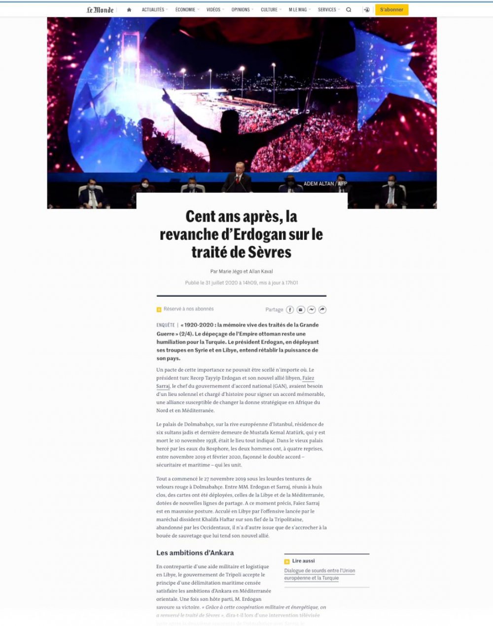 Le Monde gazetesinin "Yüzyıl sonra Erdoğan'ın Sevr Antlaşması'ndan intikamı" başlıklı haberinde, Türkiye Cumhurbaşkanı Recep Tayyip Erdoğan ve Libya Başbakanı Fayiz es-Serrac'ın Kuzey Afrika ve Akdeniz'de stratejik oyunu değiştirebilmek için unutulmaz bir anlaşmayı imzalayacakları görkemli ve tarih yüklü bir yere ihtiyaç duydukları belirtildi.