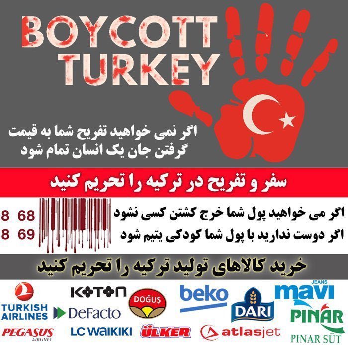 "Boykot Türkiye" adlı kampanyanın görselinde İranlılar, Türk mallarını ve barkotlarını yayınlayarak "1.5 milyon Ermeninin soykırımını kabul etmek ve Türkiye'den mal, seyahat ve eğlence alımını yasaklamak, halkın abartısına cevap olacaktır. Kuzey İran'ın dönüşü çok yakın." ifadeleri yer aldı.