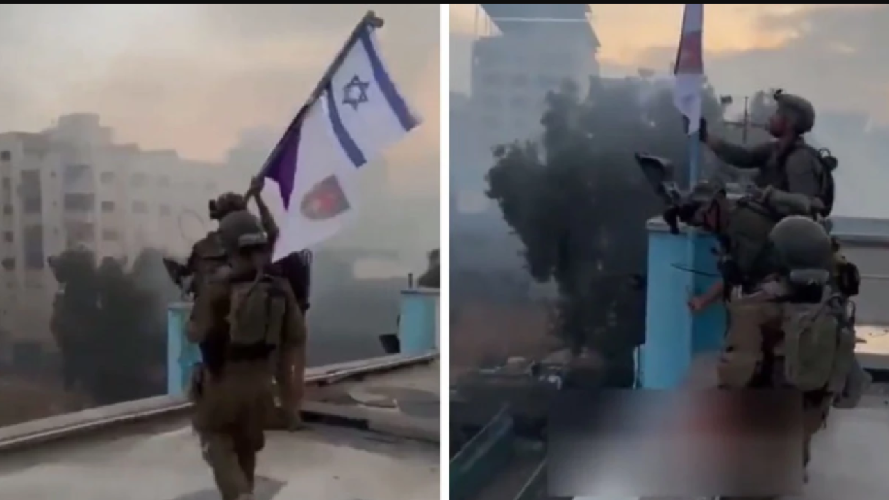 Görüntülerde 3 tane işgalci İsrail askerinin, işgal ettikleri Şifa Hastanesi'nin çatısına çıkarak İsrail bayrağı asması saniye saniye kaydedildi.