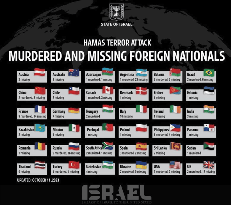 Büyükelçilik 11 Ekim itibariyle saldırılarda ölen ve kayıp yabancıların dökümünü de paylaştı.