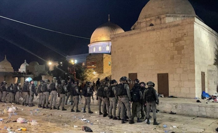 İsrail polisi, Doğu Kudüs’ün Eski Şehir bölgesinde bulunan Mescid-i Aksa’daki Kıble Mescidi’nde yatsı namazı kılan cemaate karşı ses bombaları ve plastik mermi kullandı.