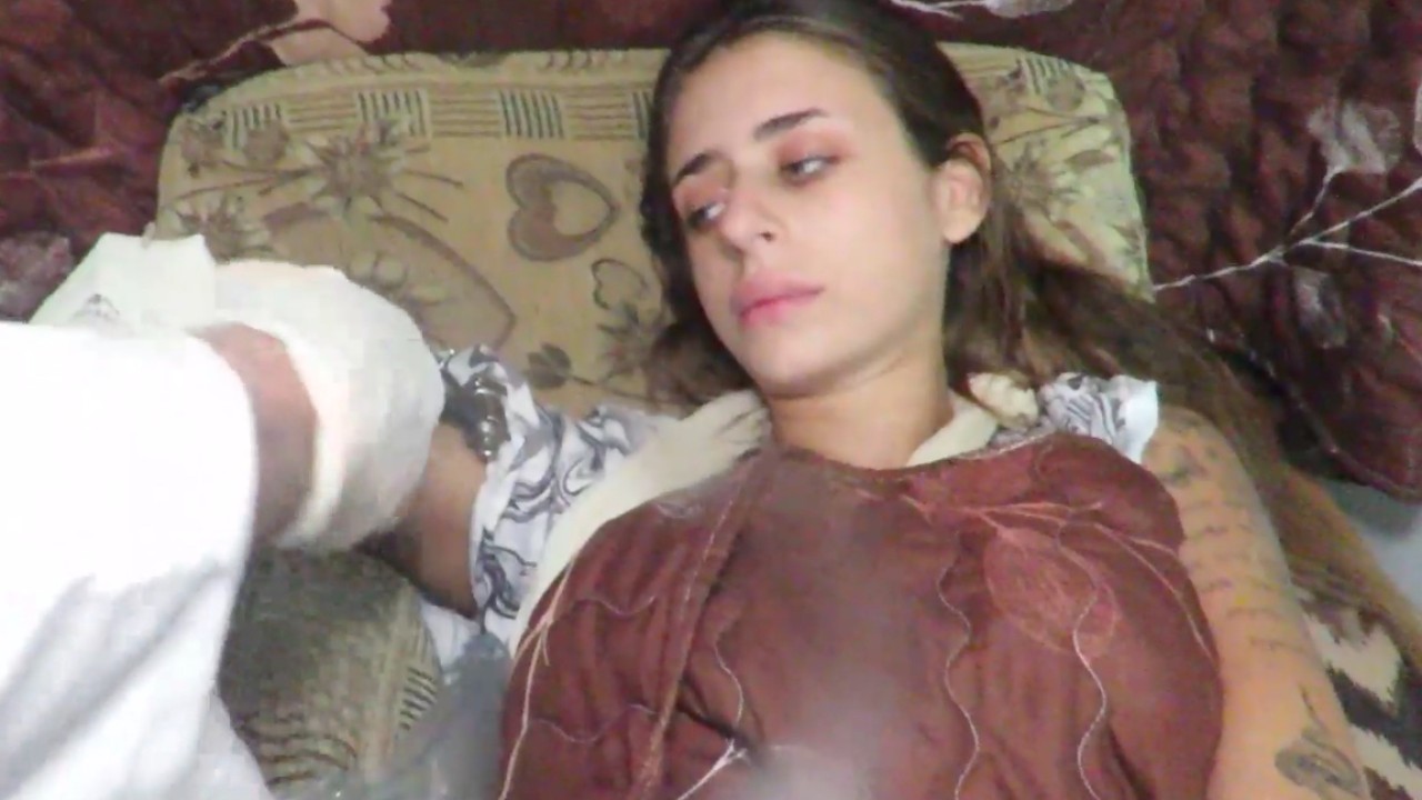 Videoda, sağ kolundan ameliyat edilen kadının, Kassam unsurları tarafından pansuman edilerek bandajlandığı anlar yer aldı.